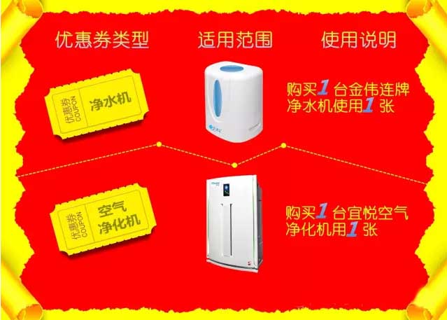 活动期间,通过微信方式申领VIP卡的顾客,首次消费一次购满1,000积分或以上产品,将获得金伟连牌净水机优惠券、宜悦空气净化机优惠券各1张,每张1,000元,优惠券在VIP卡生效后方可使用,生效当月优惠券有效,次月作废。