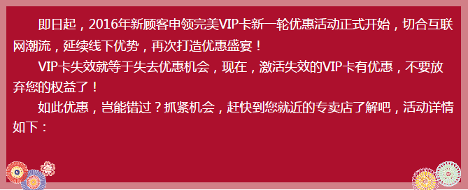 已失效的VIP卡,在活动期间一次购满1,000积分或以上产品,在次月15日经公司审核成功激活的,将获得金伟连牌净水机优惠券、宜悦空气净化机优惠券各1张,每张800元,优惠券即时可用,当月有效,次月作废。(VIP卡失效时,卡的积分和顾客等信息被清除,因此该VIP卡成功激活时,积分和顾客从零开始计算。)
