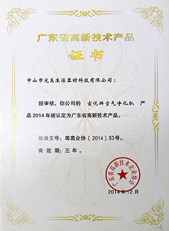 宜悦牌空气净化机被认定为广东省高新技术产品