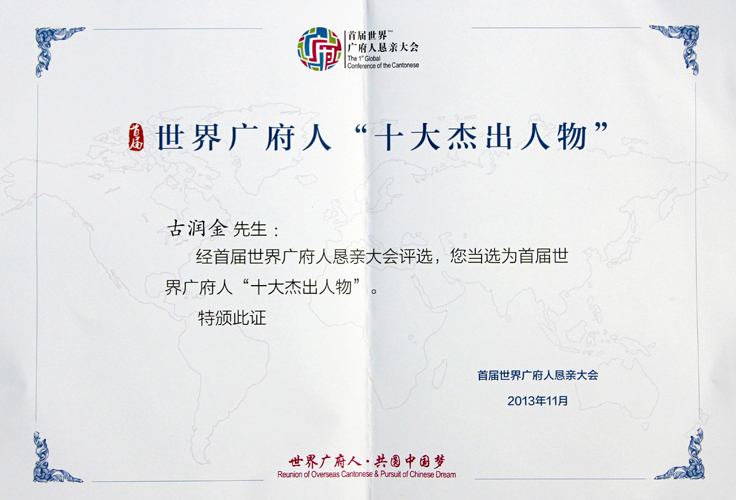 首届世界广府人“十大杰出人物”(证书)