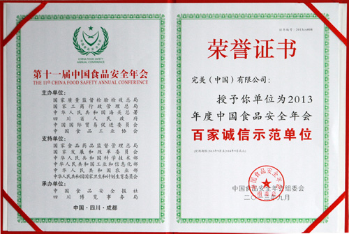 完美公司被授予2013年度中国食品安全年会十强企业
