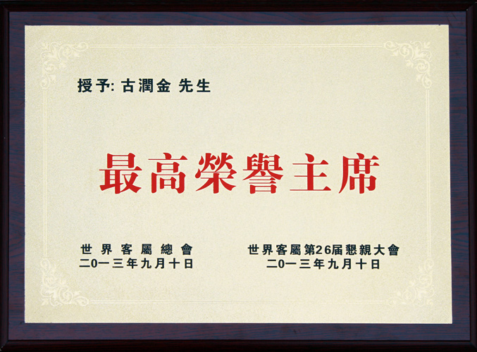古润金被授予世界客属总会最高荣誉主席