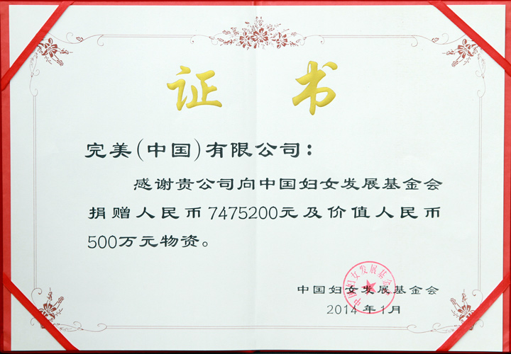 完美公司向中国妇女发展基金会捐赠7475200元人民币及价值人民币500万元物质