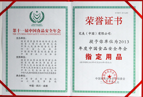 完美公司被授予2013年度中国食品安全年会指定用品