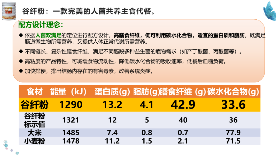 u依据人菌双满足的定位进行配方设计,高膳食纤维,低可利用碳水化合物,适宜的蛋白质和脂肪,既满足肠道微生物所需营养,又提供人体正常代谢所需营养。u不同链长、复杂性膳食纤维,满足不同肠段多种益生菌的底物需求(如产丁酸菌、丙酸菌等)。u高粘度的产品特性,可减缓食物流动性,降低碳水化合物的吸收速率,低餐后血糖负荷。u加快排便,排出结肠内存在的有害毒素,改善系统炎症。