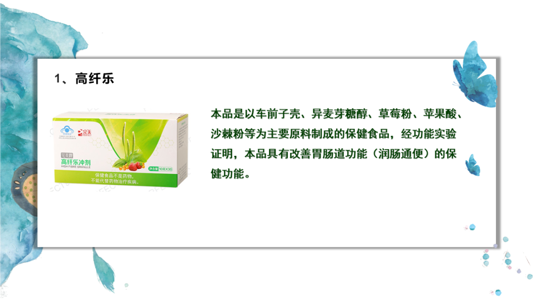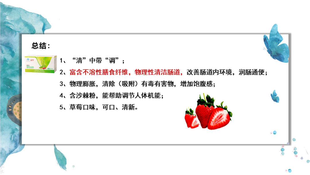本品是以车前子壳、异麦芽糖醇、草莓粉、苹果酸、沙棘粉等为主要原料制成的保健食品,经功能实验证明,本品具有改善胃肠道功能(润肠通便)的保健功能。