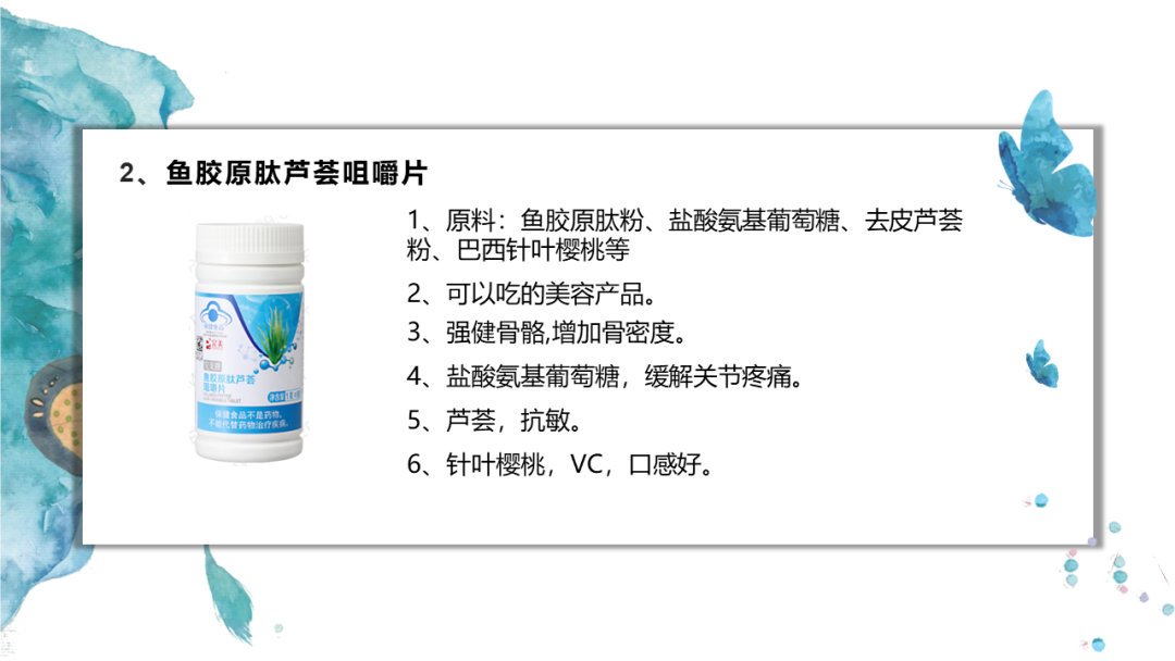 1、原料:鱼胶原肽粉、盐酸氨基葡萄糖、去皮芦荟粉、巴西针叶樱桃等