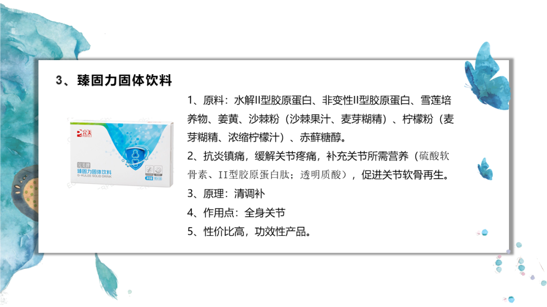 2、抗炎镇痛,缓解关节疼痛,补充关节所需营养(硫酸软骨素、II型胶原蛋白肽;透明质酸),促进关节软骨再生。