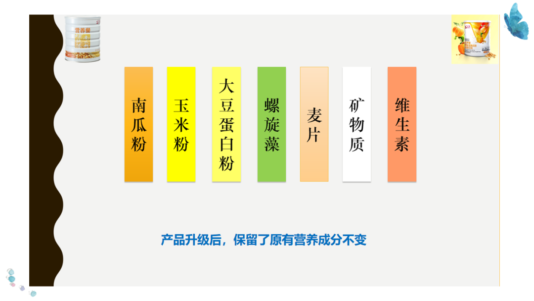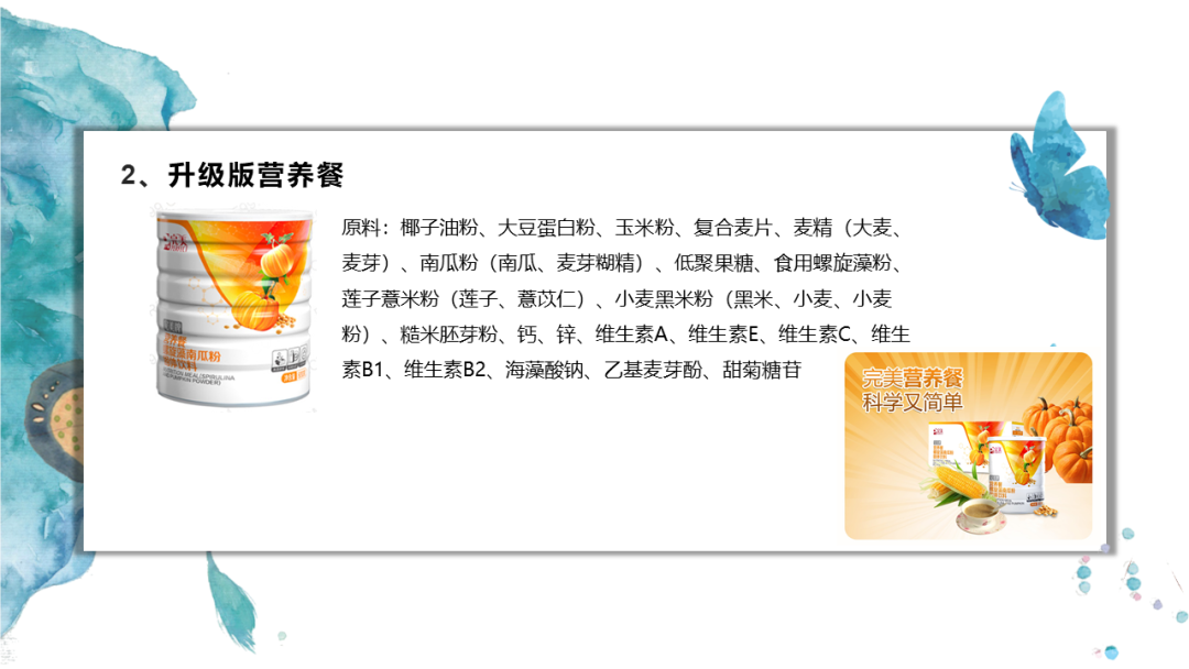 1、原料:南瓜粉、大豆肽、薏苡仁粉、低聚果糖、乳清蛋白、螺旋藻、玉米粉等。