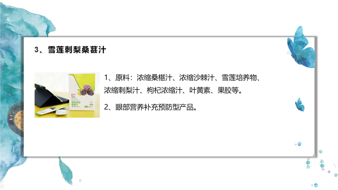1、原料:浓缩桑椹汁、浓缩沙棘汁、雪莲培养物、浓缩刺梨汁、枸杞浓缩汁、叶黄素、果胶等。