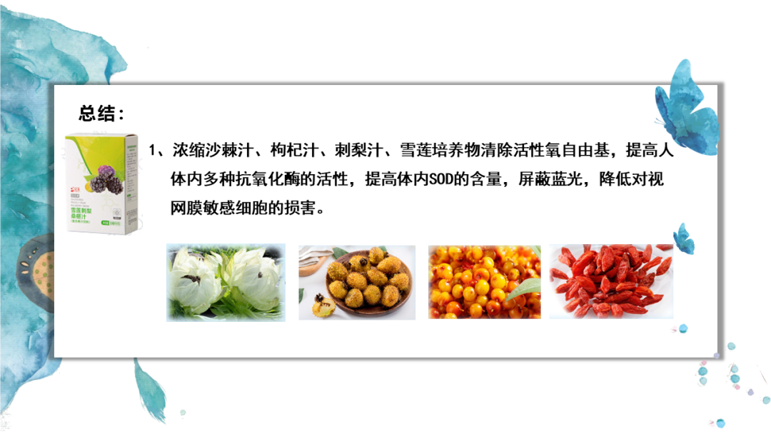1、浓缩沙棘汁、枸杞汁、刺梨汁、雪莲培养物清除活性氧自由基,提高人体内多种抗氧化酶的活性,提高体内SOD的含量,屏蔽蓝光,降低对视网膜敏感细胞的损害。