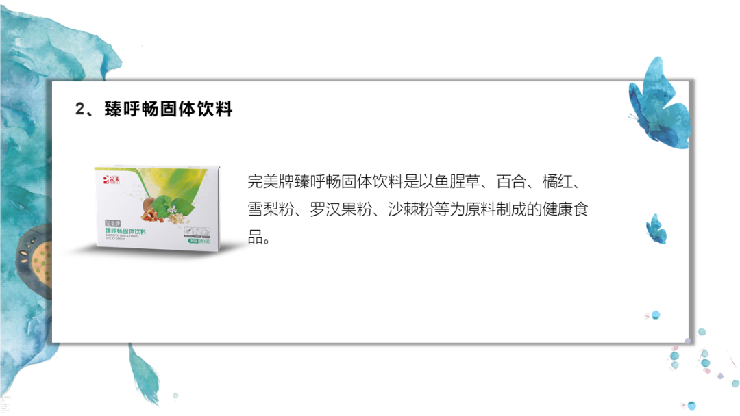 完美牌臻呼畅固体饮料是以鱼腥草、百合、橘红、雪梨粉、罗汉果粉、沙棘粉等为原料制成的健康食品。