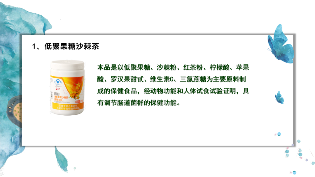 本品是以低聚果糖、沙棘粉、红茶粉、柠檬酸、苹果酸、罗汉果甜甙、维生素C、三氯蔗糖为主要原料制成的保健食品,经动物功能和人体试食试验证明,具有调节肠道菌群的保健功能。