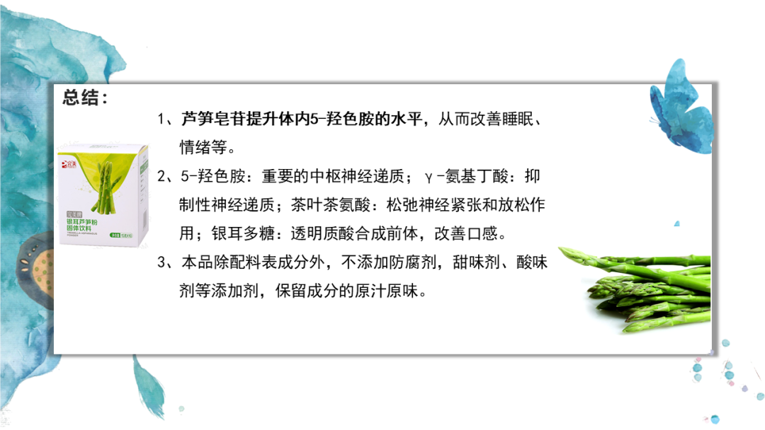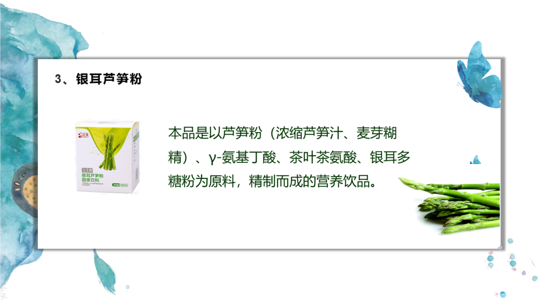 本品是以芦笋粉(浓缩芦笋汁、麦芽糊精)、γ-氨基丁酸、茶叶茶氨酸、银耳多糖粉为原料,精制而成的营养饮品。