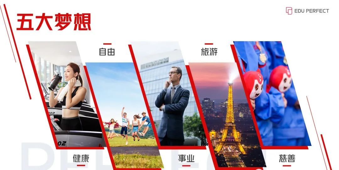 人的一生有很多梦想,在完美当中,我们有五大梦想,完美将带领我们一一实现。第一大梦想是健康。健康是人生最大的资本,如果健康是1,财富是零。只要有健康,找对方法,不断努力,后面就有无数个零,财富就会无限放大。但是如果没有健康,你将一切归零,什么也没有。