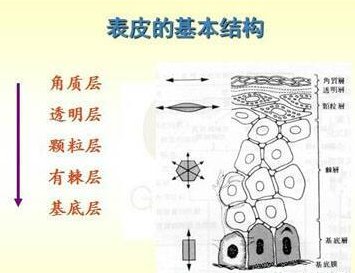 •表皮层是皮肤的最外层,平均厚度为0.07-2.0毫米,表皮内无血管,划伤表皮后不会出血,但含有丰富的神经末梢,可以帮助我们感知外界的事物。