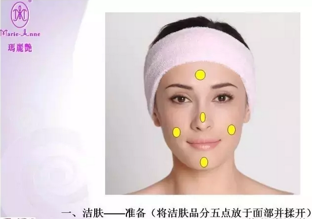 1、挤一个花生米大小的洁肤乳,点五点,下巴—左脸—右脸—鼻子—额头