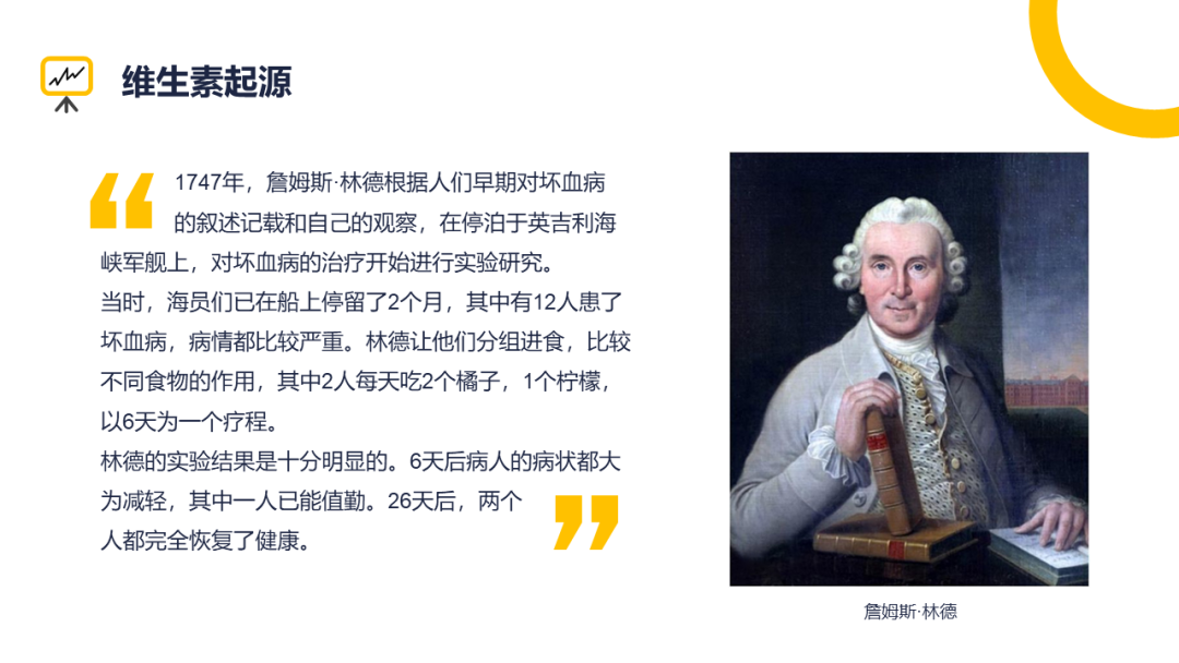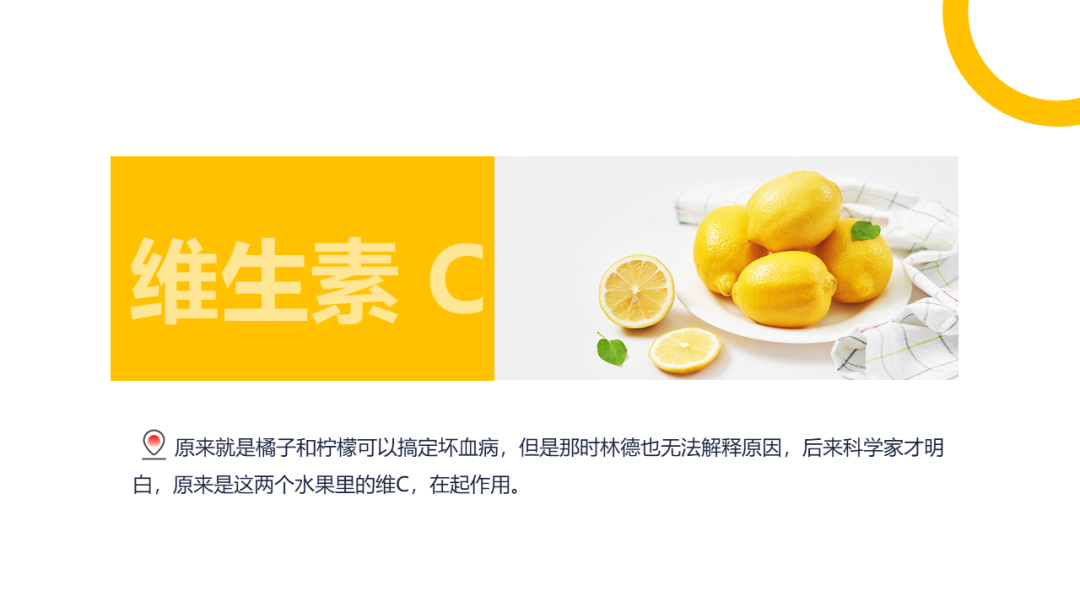原来就是橘子和柠檬可以搞定坏血病,但是那时林德也无法解释原因,后来科学家才明白,原来是这两个水果里的维C,在起作用。