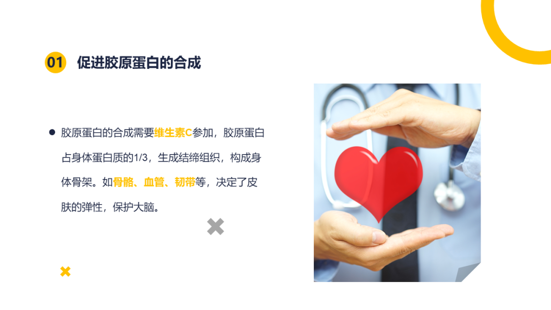 l胶原蛋白的合成需要维生素C参加,胶原蛋白占身体蛋白质的1/3,生成结缔组织,构成身体骨架。如骨骼、血管、韧带等,决定了皮肤的弹性,保护大脑。