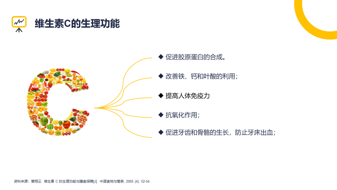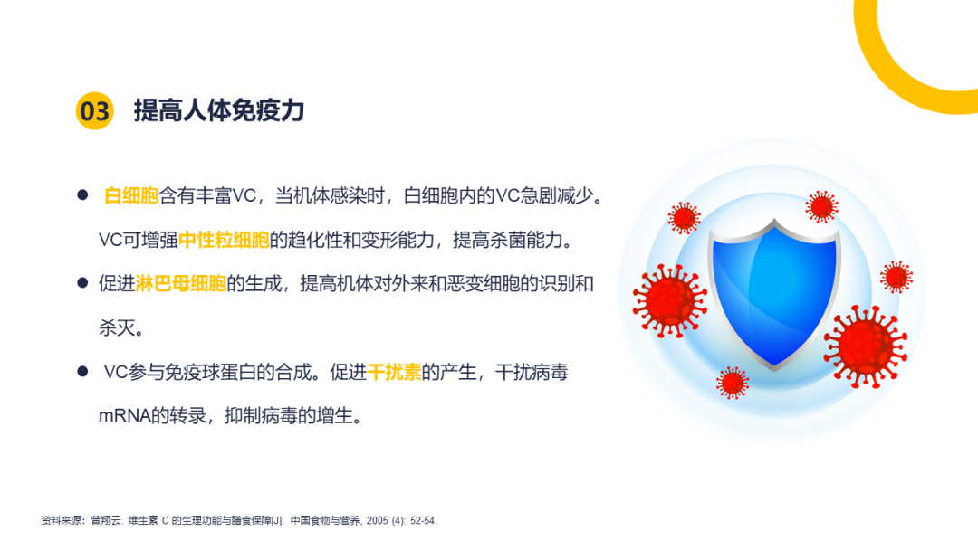 l白细胞含有丰富VC,当机体感染时,白细胞内的VC急剧减少。 VC可增强中性粒细胞的趋化性和变形能力,提高杀菌能力。l促进淋巴母细胞的生成,提高机体对外来和恶变细胞的识别和杀灭。lVC参与免疫球蛋白的合成。促进干扰素的产生,干扰病毒mRNA的转录,抑制病毒的增生。