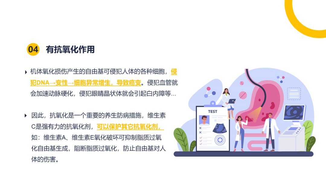 因此,抗氧化是一个重要的养生防病措施,维生素C是强有力的抗氧化剂,可以保护其它抗氧化剂,如:维生素A、维生素E氧化破坏可抑制脂质过氧化自由基生成,阻断脂质过氧化,防止自由基对人体的伤害。