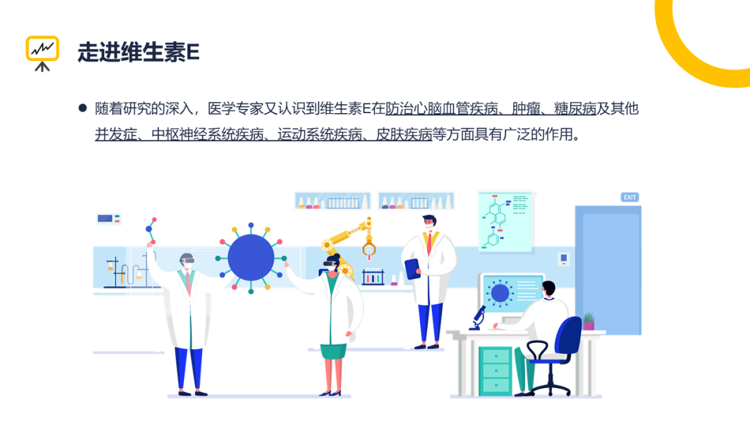l随着研究的深入,医学专家又认识到维生素E在防治心脑血管疾病、肿瘤、糖尿病及其他并发症、中枢神经系统疾病、运动系统疾病、皮肤疾病等方面具有广泛的作用。