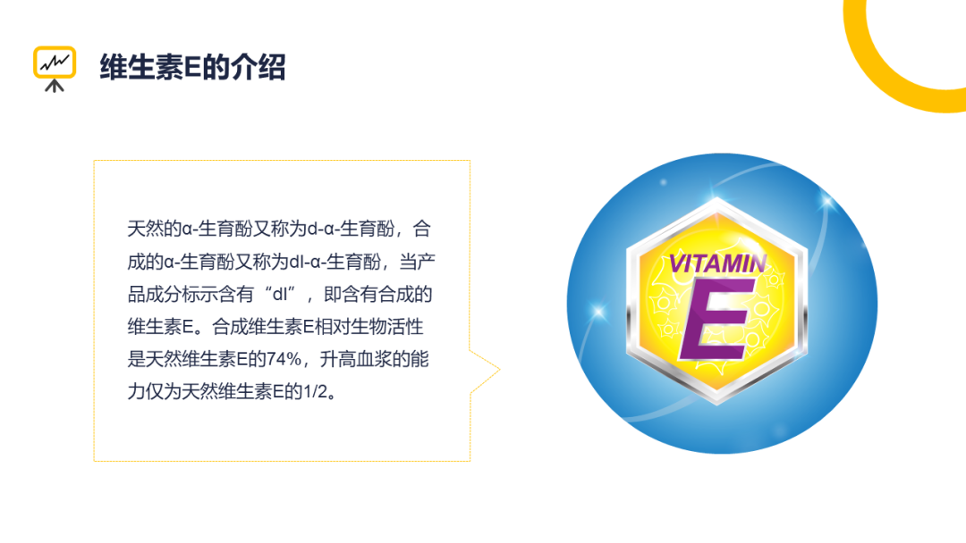 天然的α-生育酚又称为d-α-生育酚,合成的α-生育酚又称为dl-α-生育酚,当产品成分标示含有“dl”,即含有合成的维生素E。合成维生素E相对生物活性是天然维生素E的74%,升高血浆的能力仅为天然维生素E的1/2。