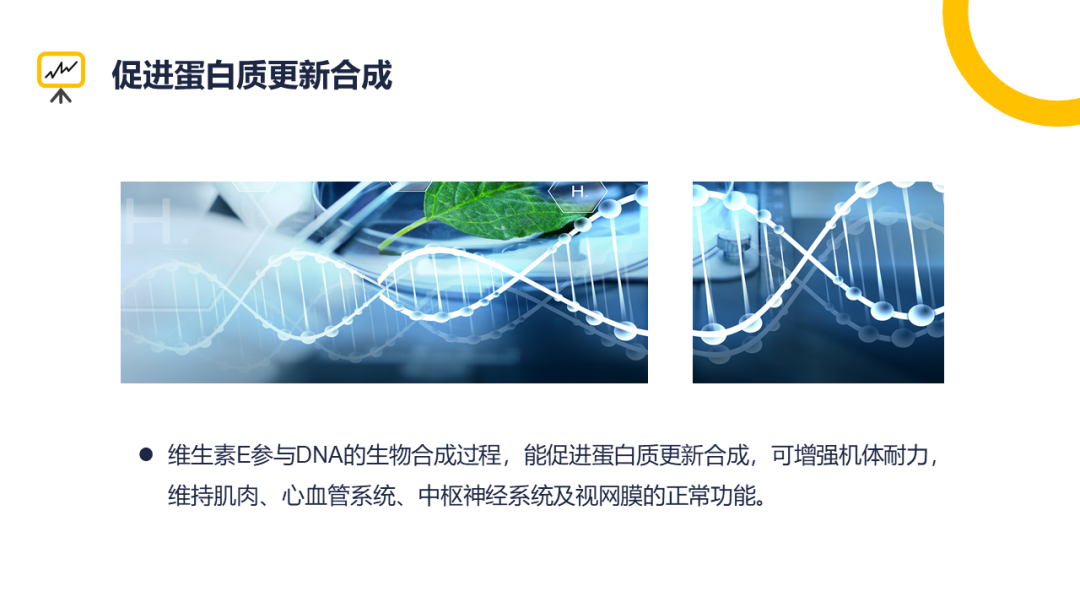 l维生素E参与DNA的生物合成过程,能促进蛋白质更新合成,可增强机体耐力,维持肌肉、心血管系统、中枢神经系统及视网膜的正常功能。