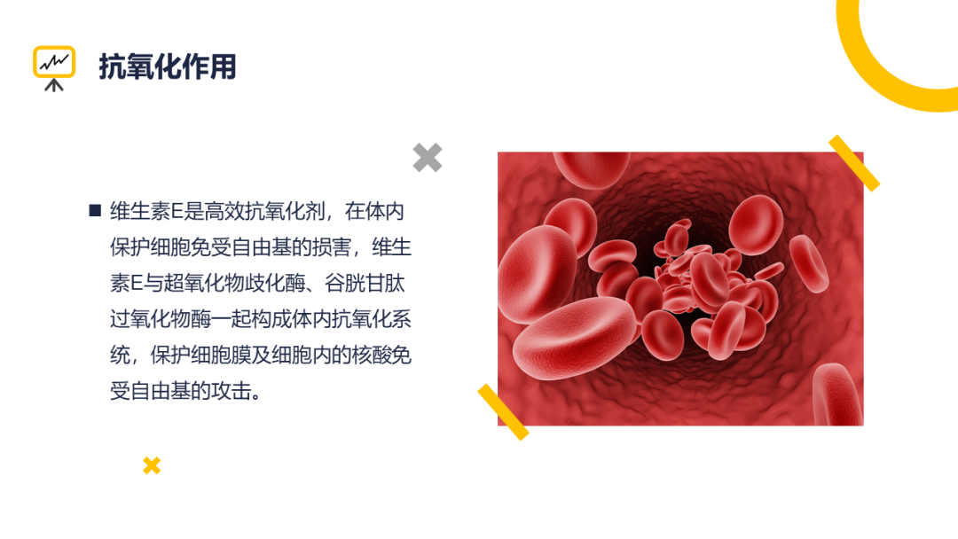 n维生素E是高效抗氧化剂,在体内保护细胞免受自由基的损害,维生素E与超氧化物歧化酶、谷胱甘肽过氧化物酶一起构成体内抗氧化系统,保护细胞膜及细胞内的核酸免受自由基的攻击。
