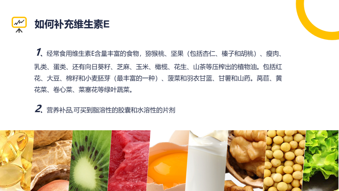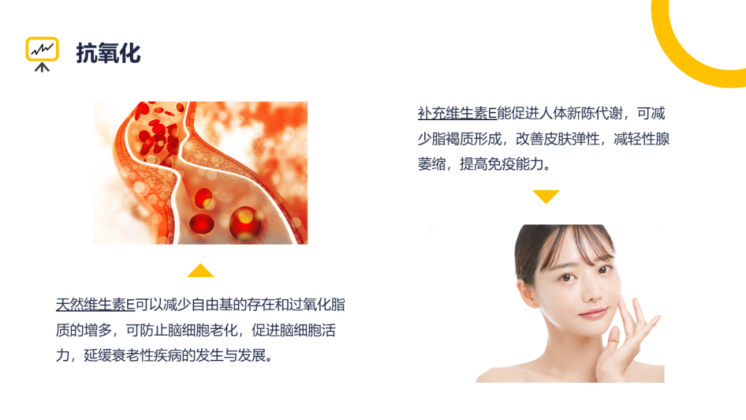 补充维生素E能促进人体新陈代谢,可减少脂褐质形成,改善皮肤弹性,减轻性腺萎缩,提高免疫能力。