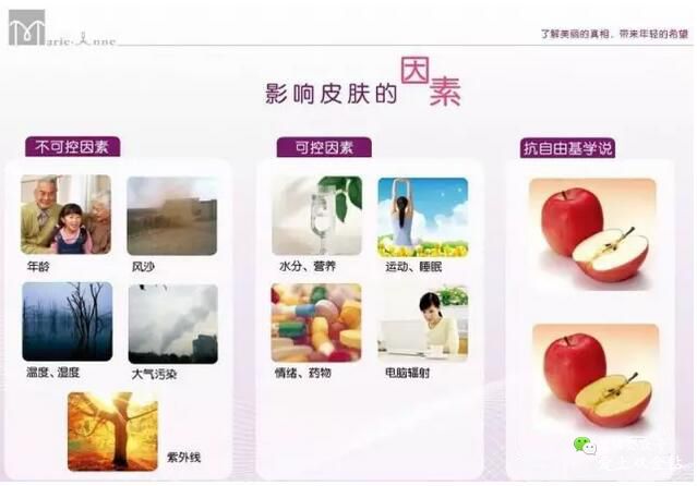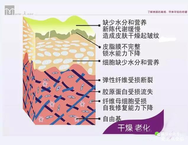 (3)岁月流失,自由基增加,表皮的新陈代谢变缓慢,导致皮肤自我修复能力减弱,即出现皱纹和老化。