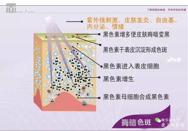 皮肤肤色不好,色素沉淀,除了皮肤的新陈代谢减弱和内分泌失调及遗传因素以外,最主要的原因就是皮肤受到紫外线的照射,基底层的黑色素母细胞产生黑色素,黑色素代谢进入皮肤周围的角质细胞。使我们的皮肤看起来晦暗变黑。当色素分布不均匀时,就形成了色素色斑。