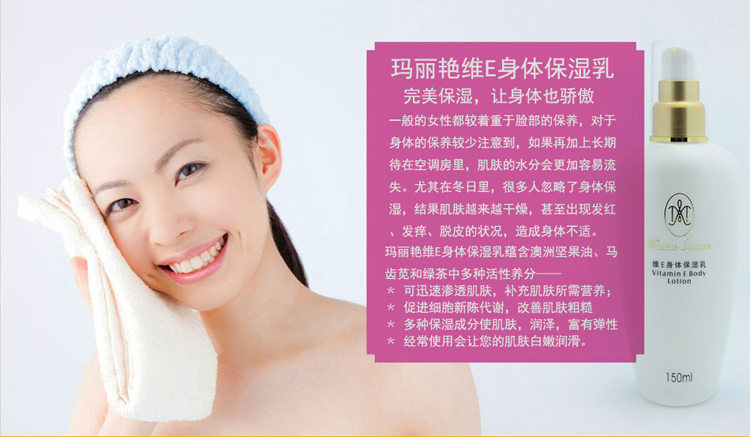 使用方法:将适量的玛丽艳维E身体保湿乳均匀地涂抹肌肤,同时轻柔地按摩,以便更好地被肌肤吸收。经常使用对养护您的肌肤会起到显著的效果。
