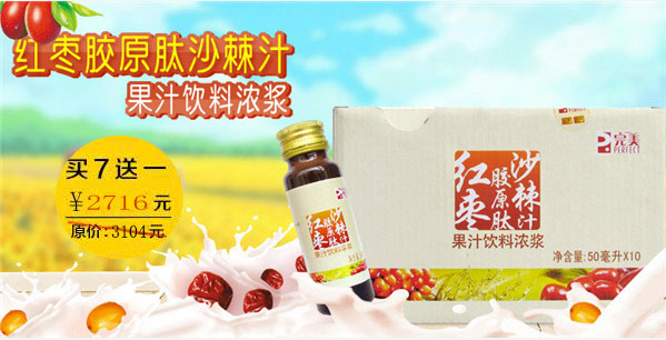 本品是以沙棘原果汁、浓缩枣汁、海洋鱼皮胶原低聚肽粉为原料,经科学配比,精制而成的营养饮品。