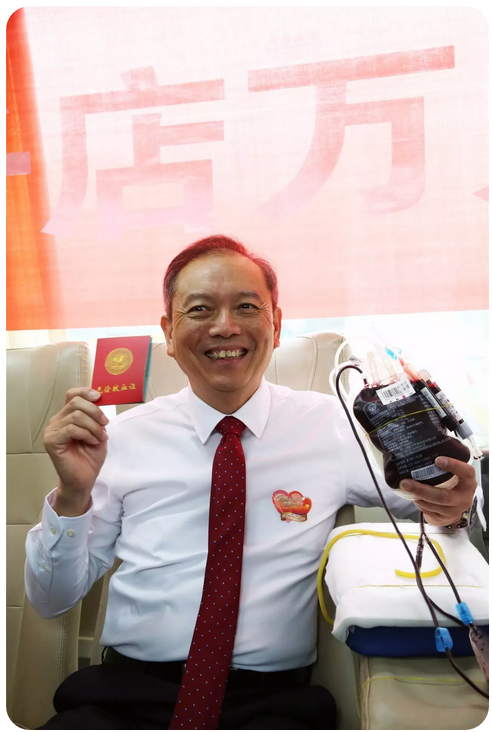 仪式后,许国伟副董事长率先带头登上献血车,他风趣幽默地跟大家聊天,从容淡定地配合医护人员开始献血,献血车上一片欢声笑语,最终许副董事长成功捐献热血400毫升,至此他已坚持无偿献血19载,23次成功献血,个人累计献血量达7200毫升。