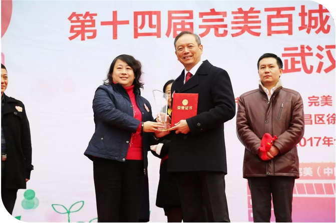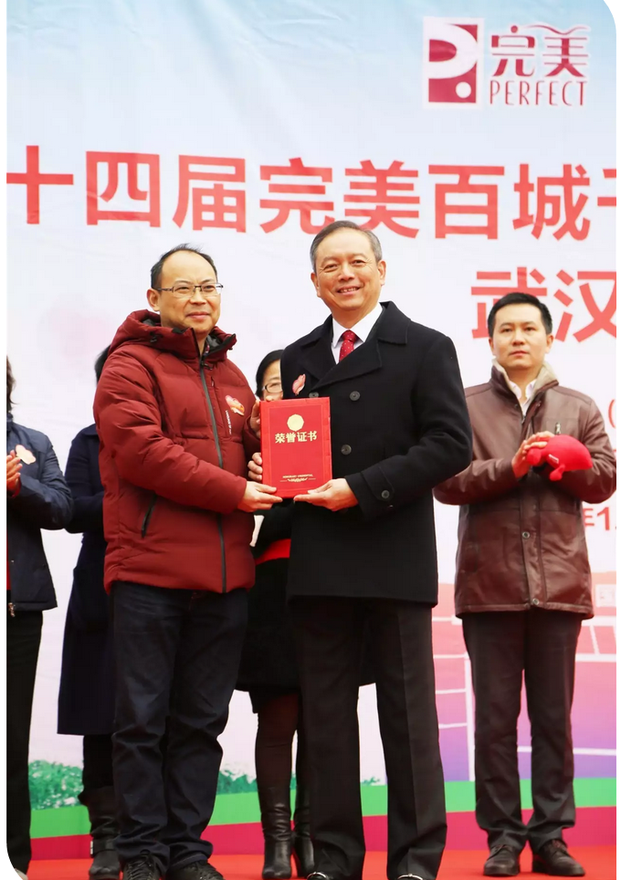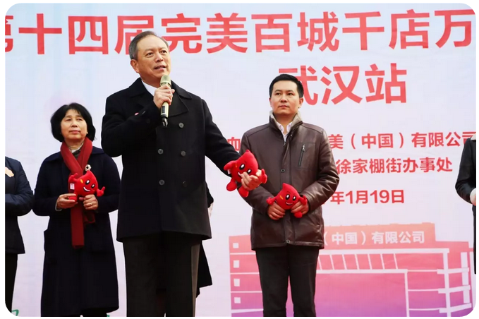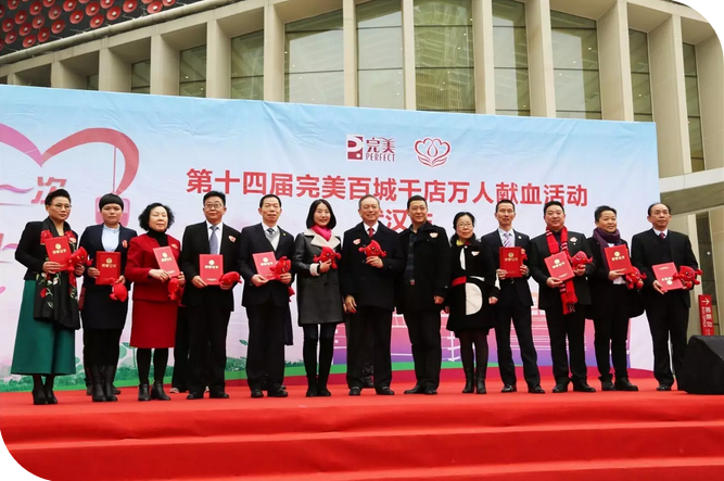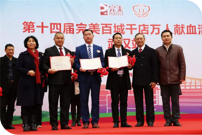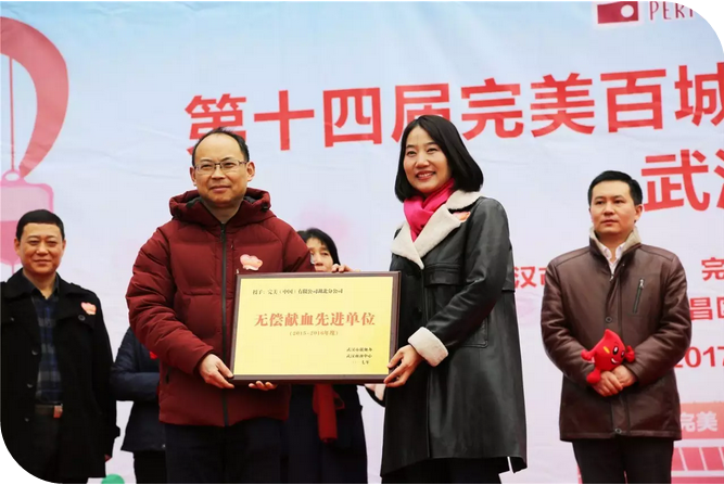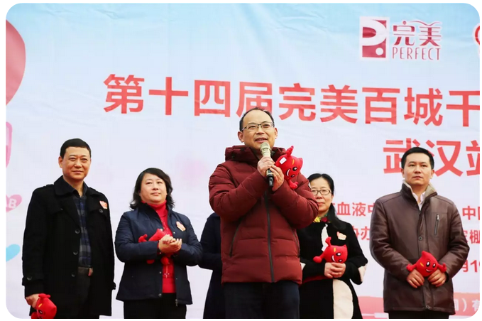 2017年1月19日上午,第十四届“完美百城千店万人献血”武汉站活动在武汉市汉秀广场举行。武昌区副区长向悦、武汉女企业家协会武昌分会会长尹文华、武汉市血液中心副主任袁明超、武昌区总工会党组书记赵文绪、武昌区徐家棚街办事处主任沈小玲、帝瑞集团总裁蔡尚融、完美公司许国伟副董事长拨冗出席活动,以实际行动倡导更多人参与、关注无偿献血事业,弘扬完美公司公益慈善理念。