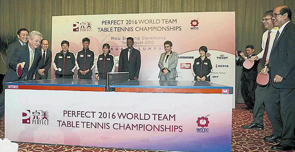 8月1日,马来西亚乒乓总会在吉隆坡举行新闻发布会,与国际乒乓联合会签署谅解备忘录,正式接过赛事主办权,并确定完美公司成为赛事的冠名赞助商。古润金董事长代表马来西亚乒乓总会与国际乒联主席托马斯·维克特、世乒赛筹委会主席韩琚元签署备忘录。这是继2000年之后,马来西亚再次承办世界乒乓球团体锦标赛,赛事将于2016年2月28日至3月6日在马来西亚雪兰莪莎阿南美拉华蒂体育馆举行,届时将有男、女各96支国家代表队参赛。