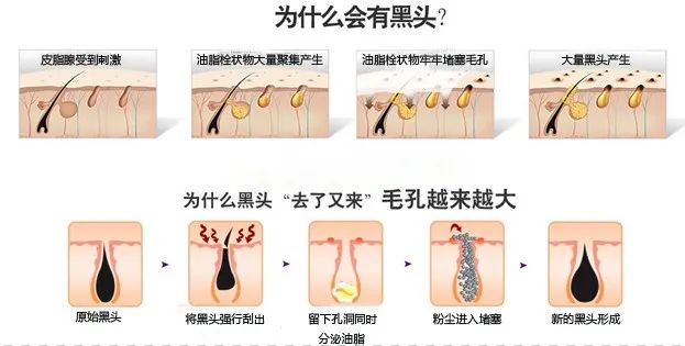 2、堵塞的毛孔和外界相通,氧化及灰尘堆积形成黑头,最终会造成毛孔进一步粗大。