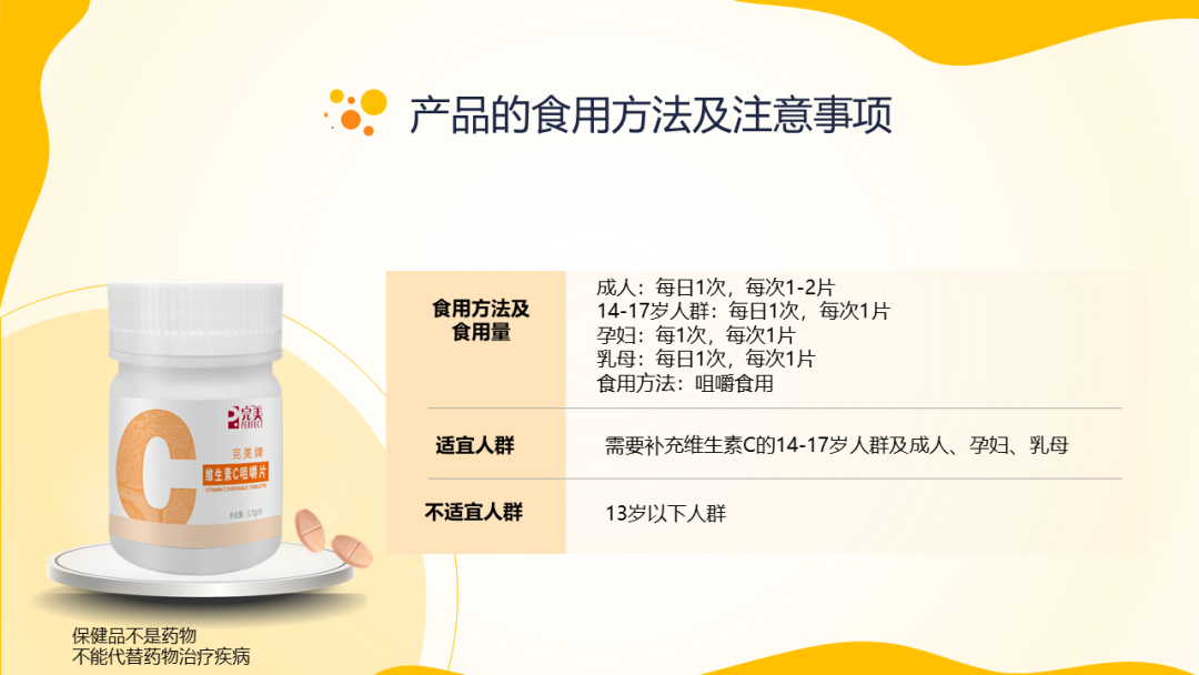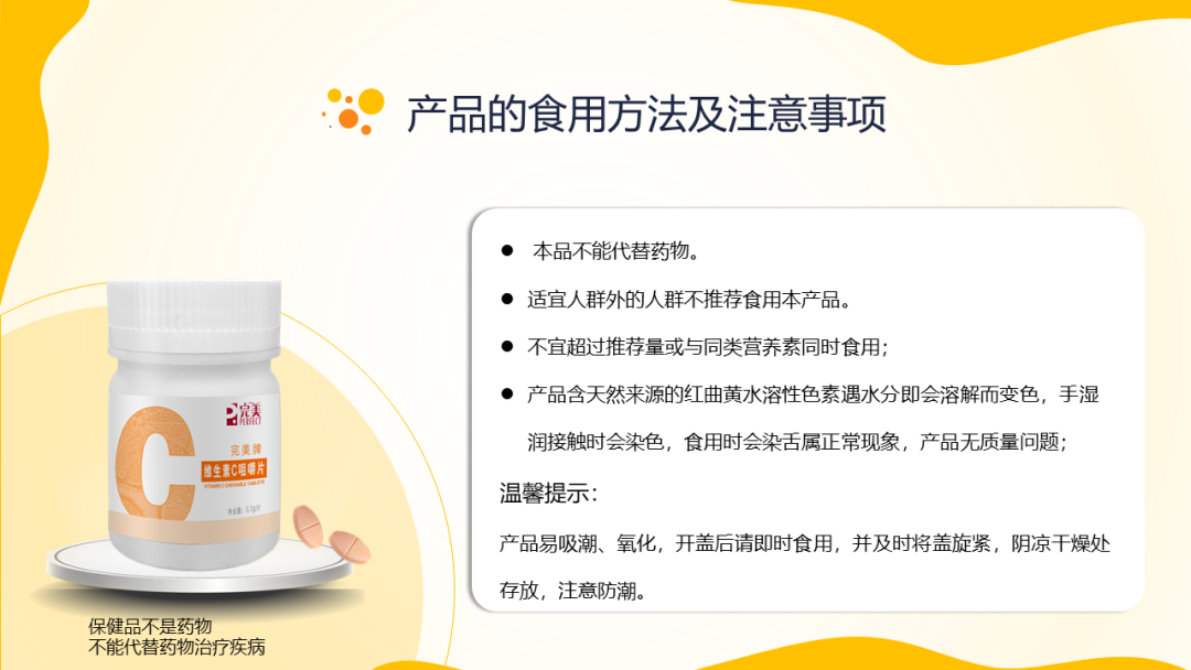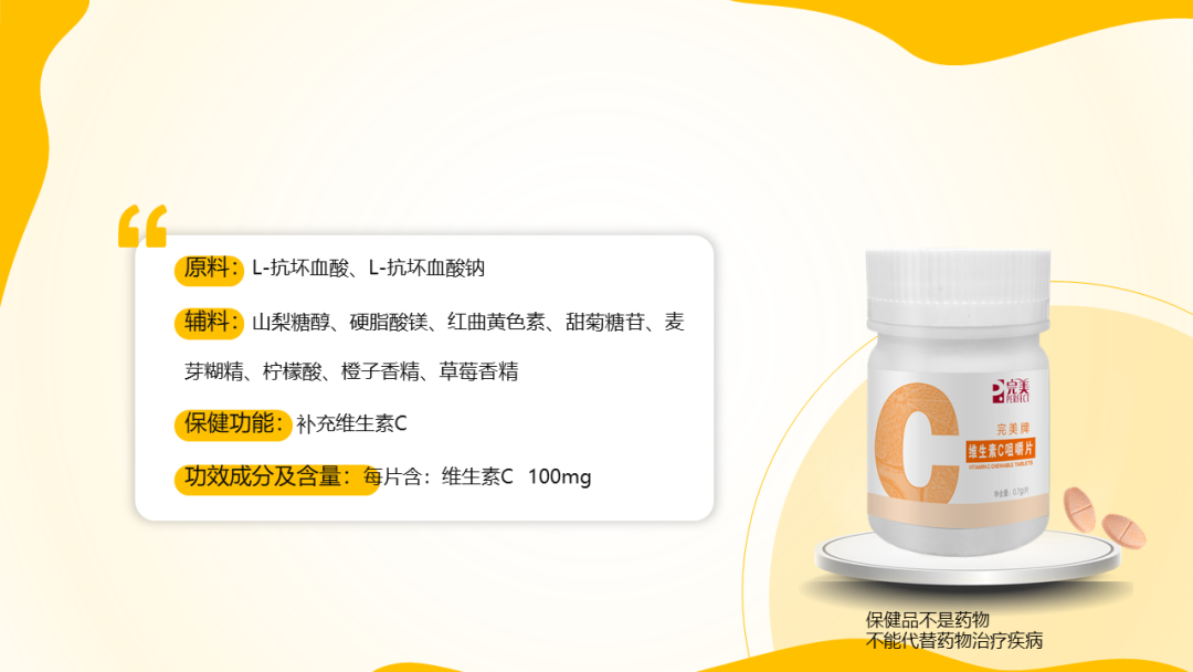 辅料:山梨糖醇、硬脂酸镁、红曲黄色素、甜菊糖苷、麦芽糊精、柠檬酸、橙子香精、草莓香精