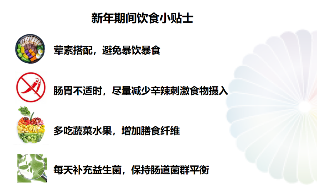 走在减肥路上的朋友们,最担心的就是过年期间“每逢佳节胖三斤”。首先,要给这些朋友一个正确的减肥观念,就是“减脂肪比减体重重要!“不要一味地追求掉秤!主要是看体脂率,腰围是否下降。掌握下面这几个新年饮食小诀窍,做到科学饮食,完全可以实现享受美食和减脂减重两不误。· 饮食顺序:好营养先一步,每顿饭可以先吃富含优质蛋白类食物,增强饱腹感,再吃蔬菜,最后进食主食,饭后再补充些益生菌,帮助消化。· 饮食搭配:三餐中增加蔬菜和水果和优质蛋白摄入,减少米饭、面条等精细主食摄入,适量多吃玉米、红薯、燕麦等含粗纤维多的主食。如果主食和粗粮吃得少,可以补充B族维生素,能加快脂肪代谢,预防脂肪堆积。· 烹饪方法:炸煎炒类食物要少吃,尽量选择蒸煮类食物。