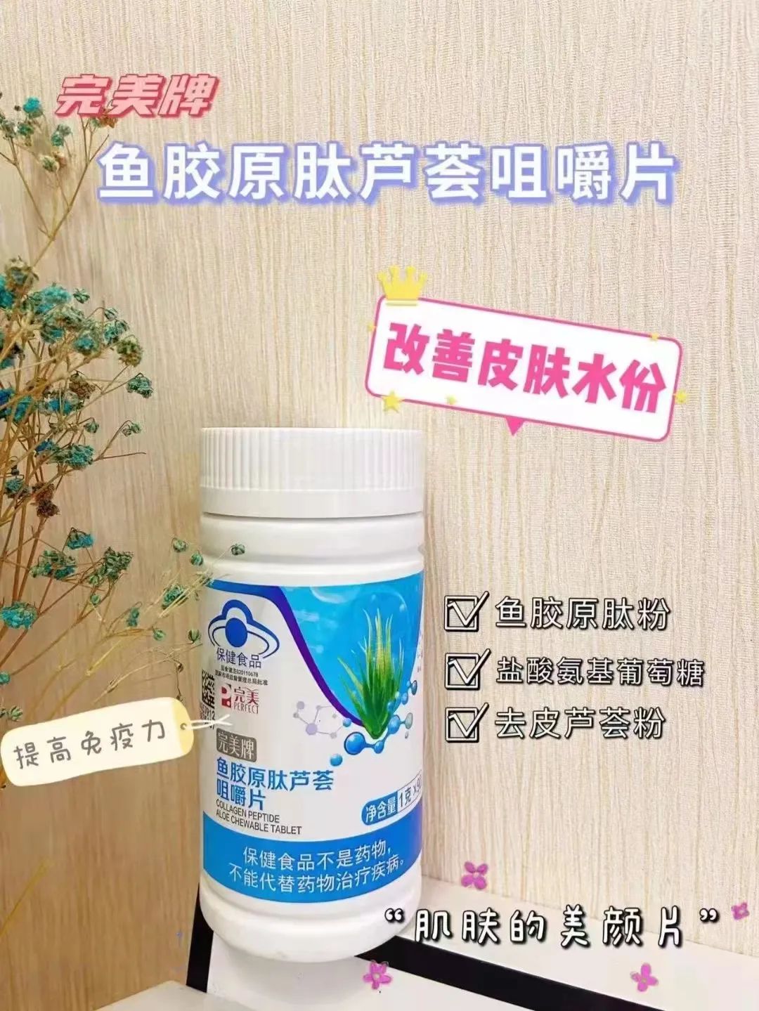 鱼胶原肽芦荟咀嚼片:又叫“美颜片”,小分子胶原蛋白被身体吸收,打通淋巴微循环,锁皮肤水分,滋养皮肤。