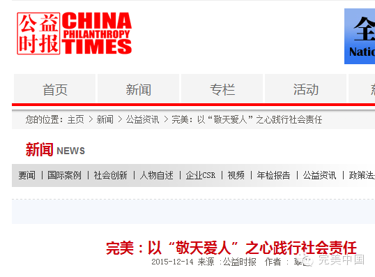“ 日前,2015“安平·北大公益传播奖”的颁奖活动在京顺利举行。完美公司成功荣获“公益支持·特别致敬”奖。会上,完美公司董事长古润金表示,天下华人一家亲,完美公司将继续发挥侨资企业的优势,以行动践行企业公民的社会责任,积极推进公益事业稳健和谐发展,让公益更有温度,让中国更加完美。