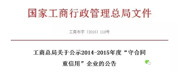 该公告内容显示,为推进企业诚信建设,规范企业合同行为,引导企业诚信履约、守法经营,国家工商行政管理总局决定,向社会公示2014-2015年度“守合同重信用”企业共6023家。