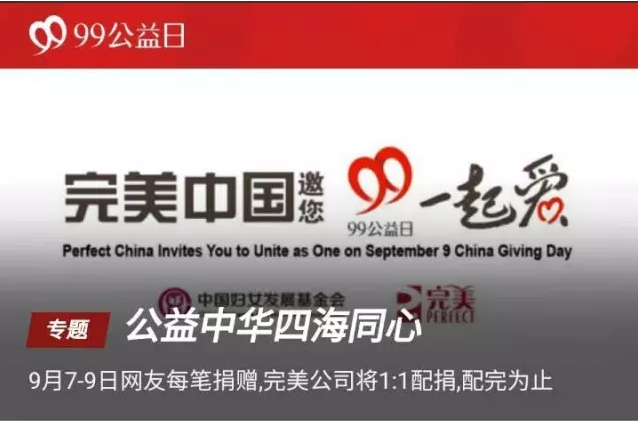 9月5日,“99公益日”启动仪式在北京召开。完美公司从“完美关爱基金”中划拨300万元参加“99公益日”企业配捐活动,款项主要用于支持中国妇女发展基金会在腾讯公益上线的全部项目,以及认领的草根NGO(民间公益组织)开展的公益项目,包括母亲水窖、母亲邮包、校园安全应急包、妈妈制造等项目。