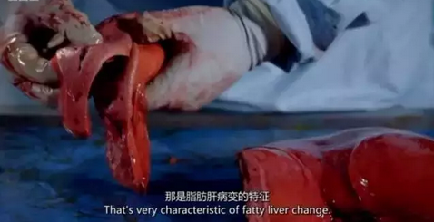 解剖到肝脏的情况也不容乐观,厚厚的脂肪堆积在肝脏,并且已经发生病变。