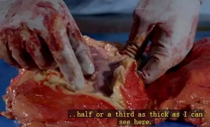 解剖专家在片中描述到:“仅划开肚子就花了很大力气,当划开后有黄色的流状物质流出,就像加热滋开的黄油”。