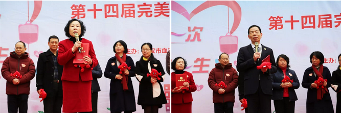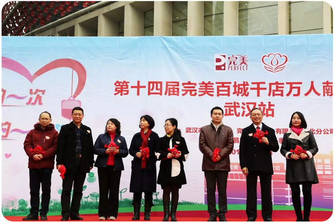 2017年1月19日上午,第十四届“完美百城千店万人献血”武汉站活动在武汉市汉秀广场举行。武昌区副区长向悦、武汉女企业家协会武昌分会会长尹文华、武汉市血液中心副主任袁明超、武昌区总工会党组书记赵文绪、武昌区徐家棚街办事处主任沈小玲、帝瑞集团总裁蔡尚融、完美公司许国伟副董事长拨冗出席活动,以实际行动倡导更多人参与、关注无偿献血事业,弘扬完美公司公益慈善理念。