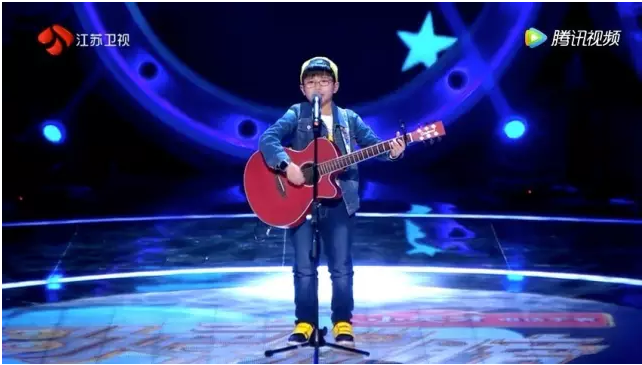 视频里9岁的小男孩儿,戴着厚厚的眼镜,十足的学生打扮,背着把吉他,站在舞台的中央。