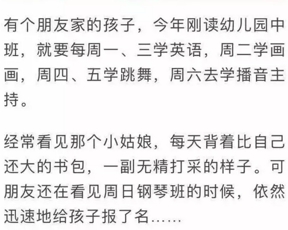 久而久之,家长们的攀比,成了孩子们辛苦奔波的理由。我们经常听到的是: