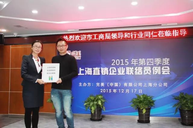 近日,由完美上海分公司承办的2015年第四季度上海直销企业联络员例会成功召开,上海市工商局直销处薛国富处长、汤耀红副处长,以及在沪直销企业代表出席了本次会议,并就直销企业在“大众创业,万众创新”时代背景下,如何加强自律,促进行业健康稳定发展进行了交流和探讨。